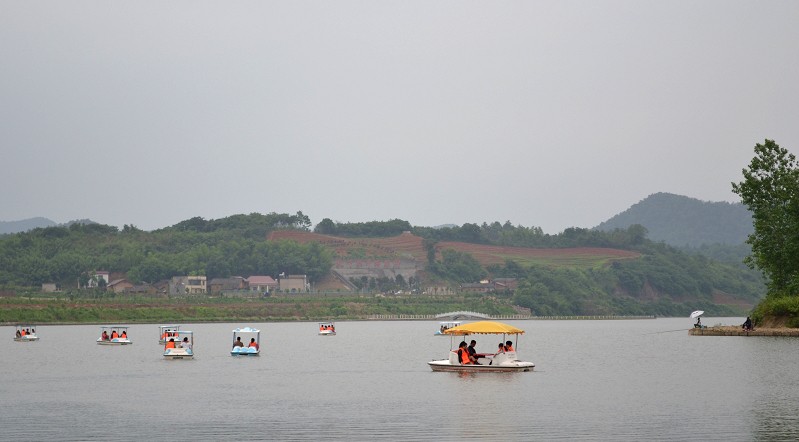 因先前聯(lián)系好了,山莊的王經(jīng)理早早就在等候我們,她把游玩的票發(fā)給大家。大家開始放飛了!有垂釣愛好者拿著早早準(zhǔn)備好的釣桿開始在河邊占地盤,喂魚食,裝蚯蚓,靜坐,大有一副姜太公釣魚之勢!不禁猜他們真正想做的不全是釣魚,而是一種心境!有的結(jié)伴沿著“湘軍橋”觀賞曾國藩、左宗棠筆墨,大聲朗誦詩詞,頗有文人風(fēng)范;有喜歡劃船的同事們來這尋找童年的步伐,三個一行,五個一伙,為安全起見,每個船上坐一位男同胞,漾著小船在河中嘻水,唱山歌;也有一些同事們爬山累了,就倚在河邊的竹亭里休息,微風(fēng)拂面,看白鴿群舞,觀孔雀開屏,拋開一切煩惱和壓力,享受著大自然的寧靜和怡然,愜意!