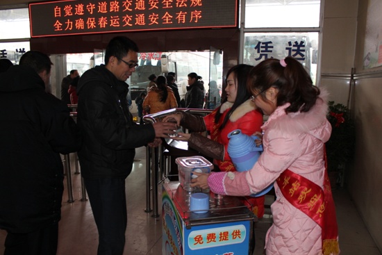 下圖為:“彩虹橋”優(yōu)質(zhì)服務(wù)班付麗艷給乘車的旅客遞上一杯熱茶,希望這杯小小的熱茶能夠?yàn)槁每万?qū)趕冬日里的寒意,添絲溫暖。